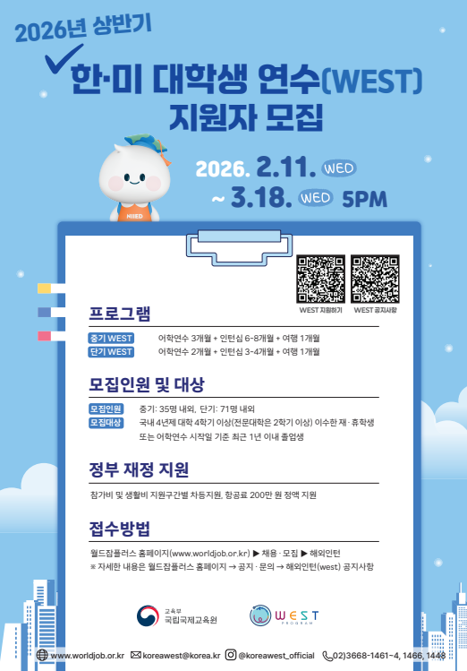 2026년 상반기 한미대학생연수(WEST) 참가자 모집 안내 국립국제교육원에서는 대학생들에게 미국에서의 어학연수 및 다양한 인턴십 기회를 제공하여 경력 및 진로 설계를 돕고, 이를 통해 글로벌 감각을 갖춘 핵심인재를 양성하기 위하여 한미 대학생 연수(WEST) 프로그램을 운영하고 있습니다. ※ WEST 참가 안내 및 프로그램 설명회(영상): 2. 25.(수), 유튜브(KOREAWEST) 업로드