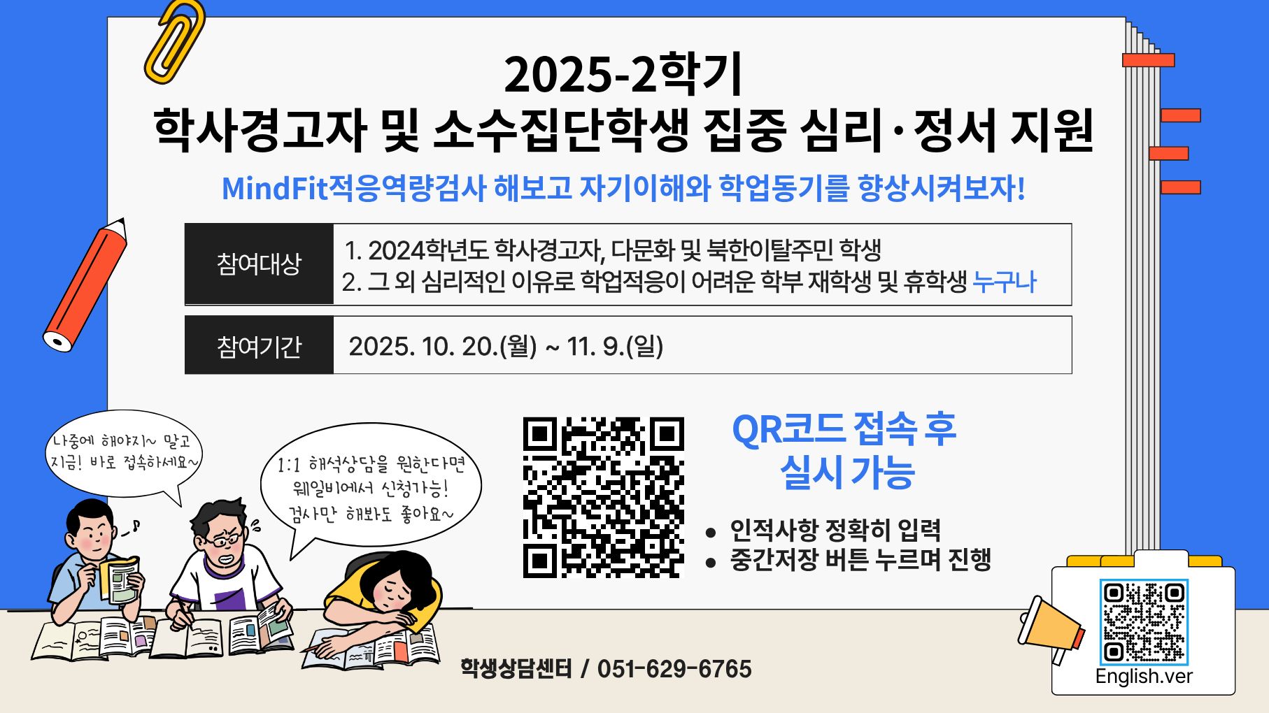 가. 대 상: ① 2024학년도 학사경고자, 다문화 및 북한이탈주민 학생 ② 그 외 심리적인 이유로 학업 적응이 어려운 학부 재학생 및 휴학생 나. 검사기간: 2025. 10. 20.(월) ~ 11. 9.(일) 다. 상담기간: 2025. 10. 27.(월) ~ 11. 21.(금) 라. 검사방법: 부경대 전용 심리검사 링크 접속 후 검사실시 ※심리검사 링크: https://inpsyt.co.kr/university/inspLoginA/pukyongcs1MINDFIT1014 마. 결과처리 - 개인별 온라인 심리검사 실시 후 결과 확인, 해석상담 희망 시 부경아이-비교과 프로그램(https://pknuai.pknu.ac.kr)에서 신청 - 해석상담 대상자 개별 연락 후 1:1 해석상담 진행