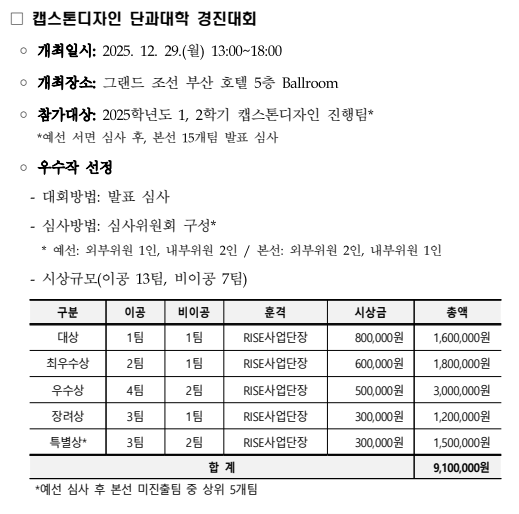 | 2025년도 캡스톤디자인 경진대회 예선 개최 안내(삼성중공업 경진대회/교내 단과대학 경진대회) | ||||||||||||