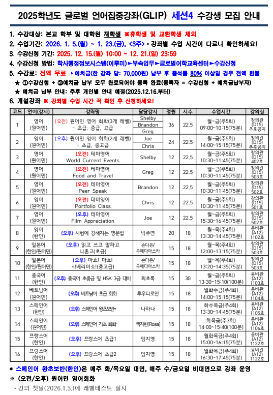 | 2025학년도 글로벌 언어집중강좌(GLIP) 세션4 모집 안내 | |||