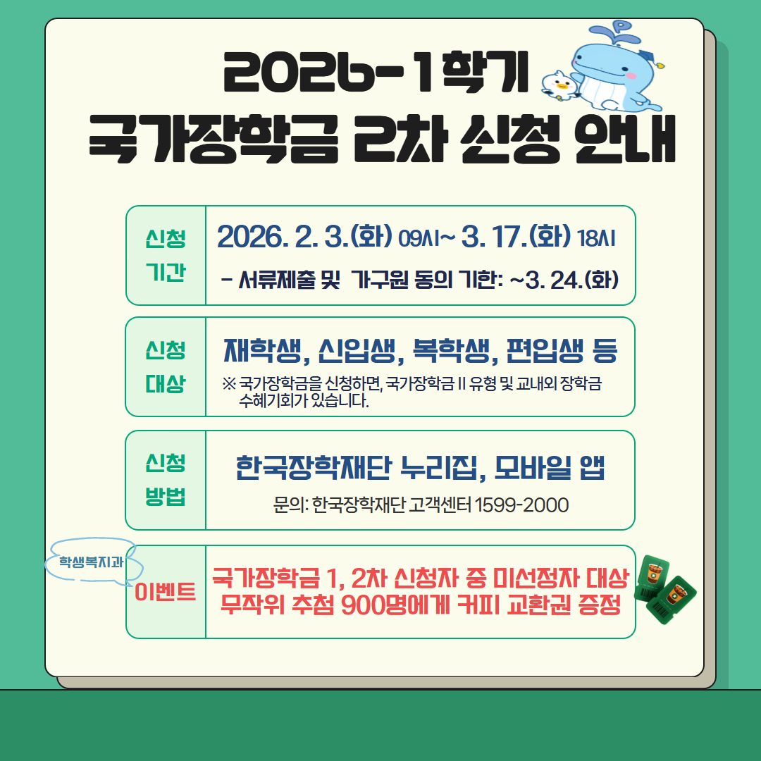 | 2026학년도 1학기 국가장학금 2차(최종) 신청 및 이벤트 안내 | |||